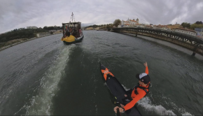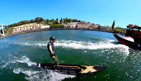 Watch SUP boarder Bruno Hasulyo surfing the wake of a boat down a river in Portugal, there isn’t really the [&hellip